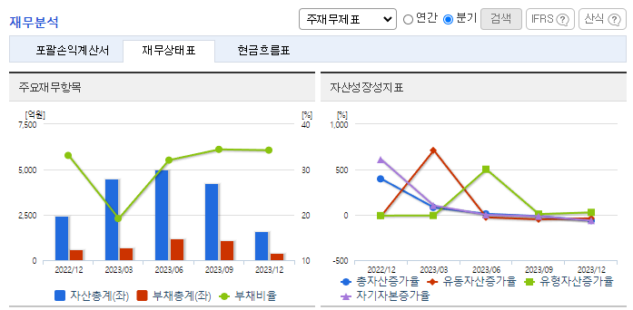 -2023년 9월 전년동기 대비 별도기준 매출액은 26.1% 감소, 영업손실은 97.9% 증가, 당기순이익 흑자전환. 동사의 미래 주 사업인 폐배터리 Recycling Business는 향후 폭발적인 수급이 예상되는 2차 전지 제작에 필요한 각종 소재를 생산하는 신규사업. 탄산리튬 제조 공장을 건설하기 위하여 2023년 4월 새만금 산업단지1공구 내 61,000㎡ 공장부지를 매입하였으며 2026년 하반기까지 완공할 계획.