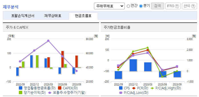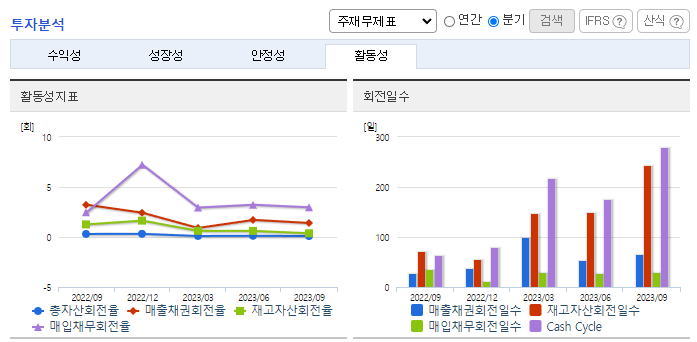 -2023년 9월 연결기준 매출액은 전년동기대비 58.2% 감소함. 주요 매출처인 중국시장의 전년대비 전기차 보조금 감소 영향으로 2차전지 시장의 Needs가 감소함에 따라 매출이 감소함. 다만, 사업다각화 목적으로 추진 중인 소재사업부문은 매출이 증가. 기존사업의 강화 및 수익성 다각화를 목적으로 충북음성 부지에 2차 전지 소개 임가공 사업 관련 공장증설 등 지속적인 시설투자를 진행하고 있음.
