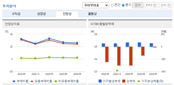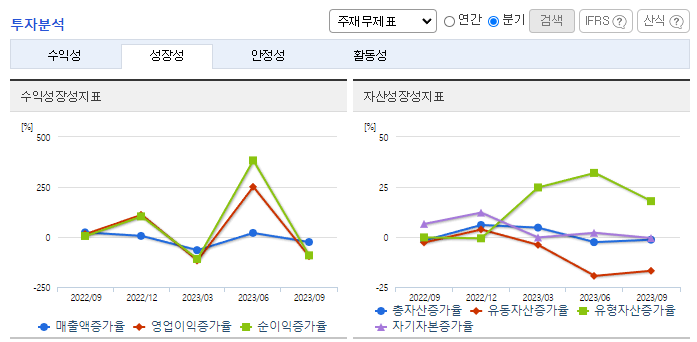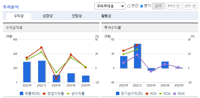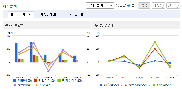 -2023년 9월 연결기준 매출액은 전년동기대비 58.2% 감소함. 주요 매출처인 중국시장의 전년대비 전기차 보조금 감소 영향으로 2차전지 시장의 Needs가 감소함에 따라 매출이 감소함. 다만, 사업다각화 목적으로 추진 중인 소재사업부문은 매출이 증가. 기존사업의 강화 및 수익성 다각화를 목적으로 충북음성 부지에 2차 전지 소개 임가공 사업 관련 공장증설 등 지속적인 시설투자를 진행하고 있음.