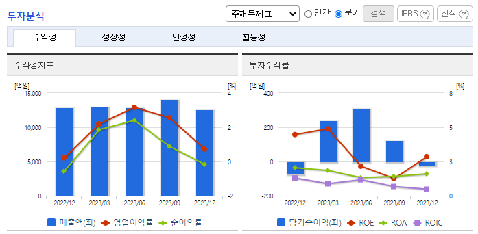 -2023년 12월 전년동기 대비 연결기준 매출액은 0.6% 증가, 영업이익은 20.3% 감소, 당기순이익은 34.5% 감소. 영업이익과 당기순이익은 원재료비와 물류비 상승으로 원가 및 판관비가 전반적으로 상승했기 때문에 감소하였음. 지속된 국제 원자재 가격 및 곡물가격 인플레이션 현상도 안정세를 보일 것으로 전망하며, 2024년에는 금리도 하향 안정세로 접어들면서, 당사의 수익성 역시 예전 수준으로 복귀할 것으로 예상함.