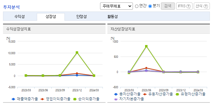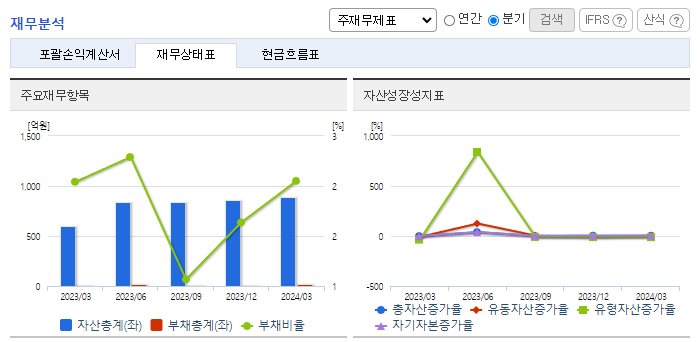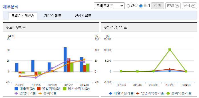 -2024년 3월 전년동기 대비 별도기준 매출액은 70.1% 증가, 영업이익 흑자전환, 당기순이익 흑자전환. 벤처투자조합 및 농림수산식품투자조합을 포함하여 3,726억 원의 조합을 운용하고 있으며 투자 대상 활성화로 매출이 크게 성장하였음. 운용펀드 규모를 대형화함으로써 중장기적으로는 Venture Investment부터 Private Equity를 아우르는 다양한 Deal을 다루는 투자회사가 되도록 노력하고 있음.