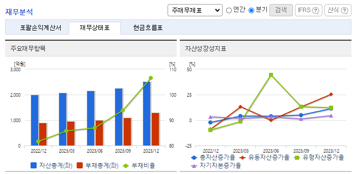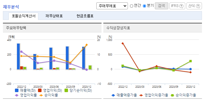 -2023년 12월 전년동기 대비 연결기준 매출액은 6.4% 증가, 영업이익은 62.7% 감소, 당기순이익은 27.7% 증가. 영업이익이 59억원(62.7%) 감소하였으나, 법인세비용의 감소로 인하여 107억 원 당기순이익을 시현했음. 동사의 핵심 신호제어 장비들과의 라인업경쟁력을 기반으로 국가철도공단, 서울교통공사 및 지방철도운영기관의 전자연동장치 시장에 적극적으로 진출할 예정임.