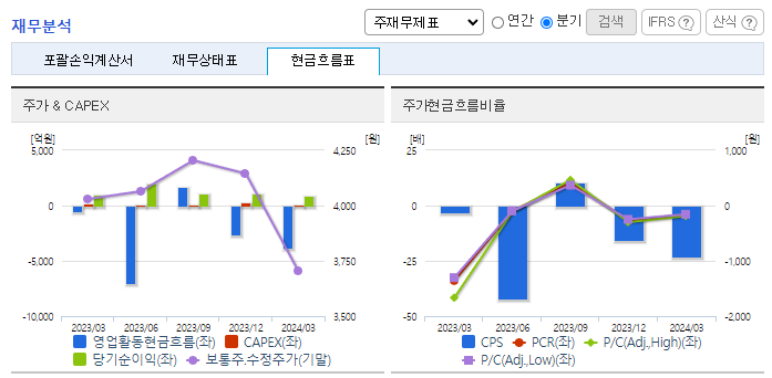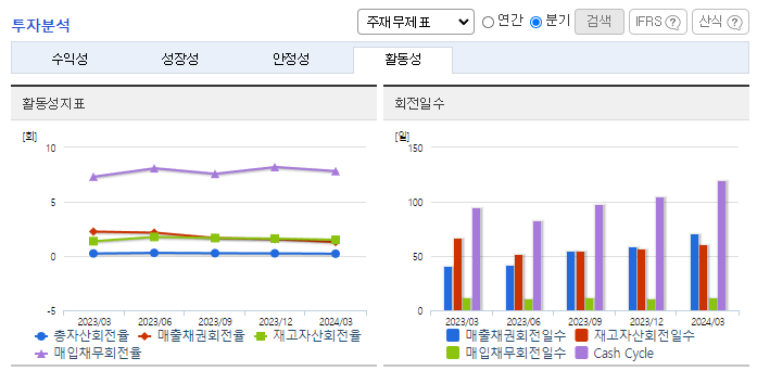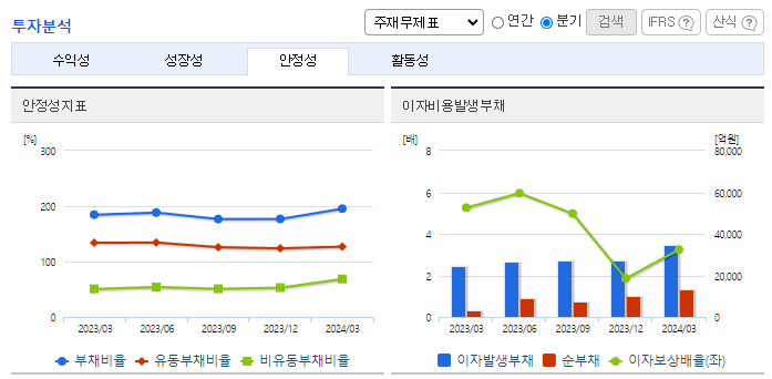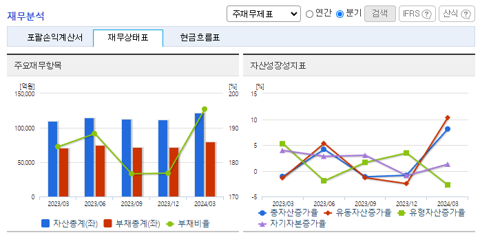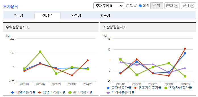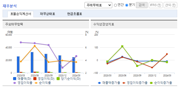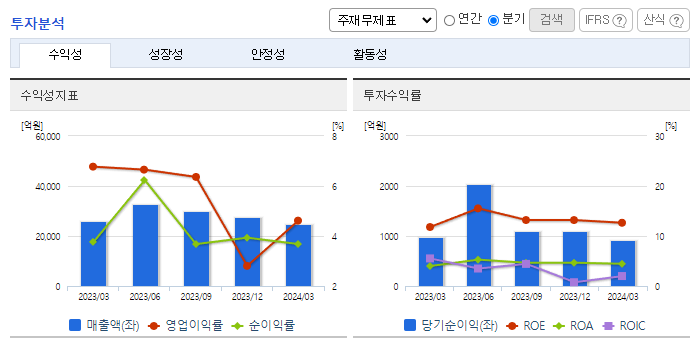 -2024년 3월 전년동기 대비 연결기준 매출액은 4.6% 감소, 영업이익은 35% 감소, 당기순이익은 9% 감소. 원가율상승 및 인건비의 등의 고정비용부담이 증가하여 영업이익이 전년동기 대비 소폭 감소함. 이라크 대형 현장의 공정이 2023년에 정점에 도달하여 매출이 소폭 감소하였으나 이라크의 해외시장 거점 공고화를 통해 Al Faw 항만 후속 및 파생 공사 수주를 추진할 예정임.