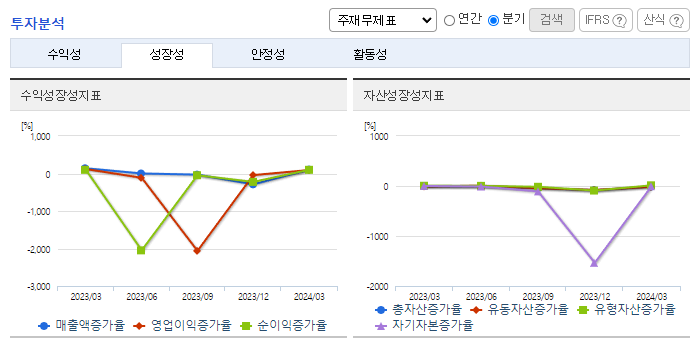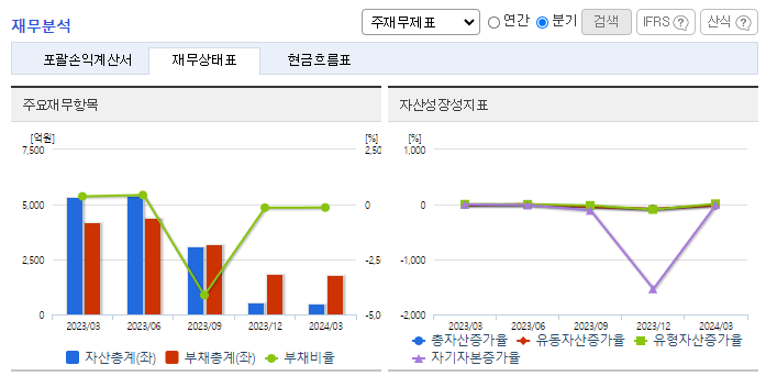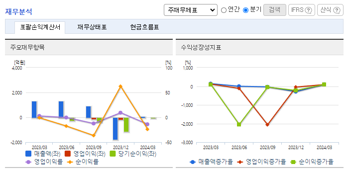 -2023년 12월 전년동기 대비 연결기준 매출액은 29.7% 감소, 영업손실은 1343.9% 증가, 당기순손실은 328.8% 증가. 정보통신 사업부문에서는 FTTH 등 제품 매출 감소, 에너지 사업 부문에서는 태양광발전소시공 및 발전 용역과 전력 매출이 전년 대비 크게 감소하며 전체 외형이 축소됨. 외형 축소에도 불구하고 판관비가 전년 대비 급증하며 영업적자 폭이 대폭 확대.