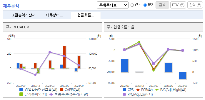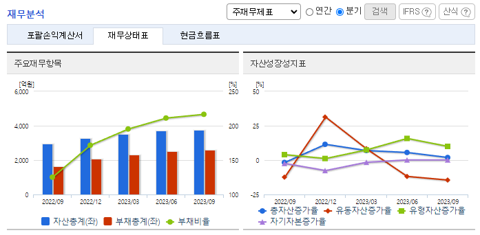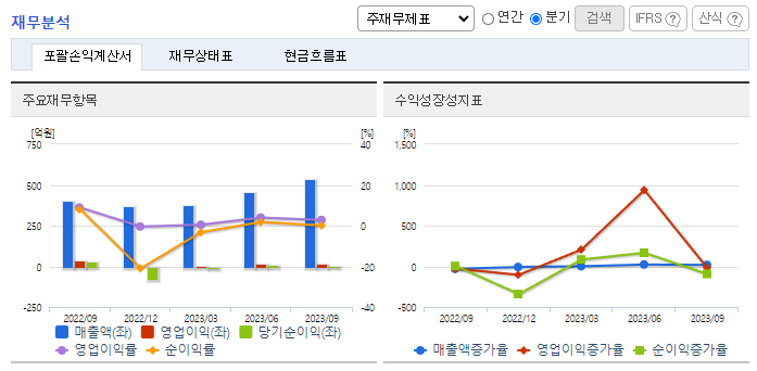 -2023년 9월 전년동기 대비 연결기준 매출액은 0% 증가, 영업이익은 71.2% 감소, 당기순이익 적자전환. 현재 2023년도에는 초기효율이 많이 개선된 실리콘 산화물로 초기효율 85%∼88%의 다양한 제품군으로 양산 준비를 하고 있음. 또한 차세대 실리콘계 음극재로 초기효율(∼90%), 방전용량(≥1800mAh/g)이 획기적으로 개선된 제품을 파일롯 단계에서 고객사들의 평가와 피드백을 받으며 제품화 진행 중.