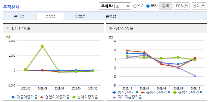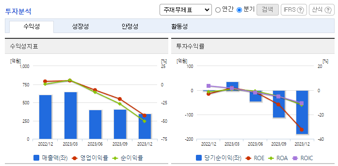 -2023년 12월 전년동기 대비 연결기준 매출액은 5.2% 감소, 영업이익 적자전환, 당기순손실은 855.2% 증가. 광통신 제품의 수요가 급속히 감소되고 광섬유의 시장가격 또한 크게 하락하여 회사의 영업이익은 적자로 전환함. 동사가 속한 섹터의 올해 시장 환경이 우호적이지 않으나, 시장의 바닥을 확인하고 서서히 회복기미가 보이고 있어 수익 회복의 기회는 여전히 열려있음.
