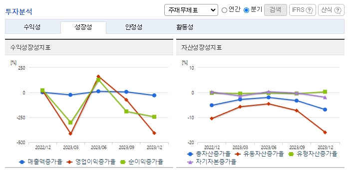-2023년 12월 전년동기 대비 연결기준 매출액은 22% 감소, 영업손실은 53.4% 감소, 당기순손실은 29.8% 감소. 2023년은 러시아-우크라이나 전쟁의 지속 및 중동지역의 국지적인 전쟁 발발 등의 여파 등으로 인한 고환율, 고금리, 인플레이션 경제적 위험이 복합적으로 존재했음. 동사는 어려운 경영사항을 타파하기 위해 새로운 비즈니스 모델과 장기적으로 수익을 창출할 수 있는 미래사업 발굴을 계속하여 위기를 극복하고자 함.