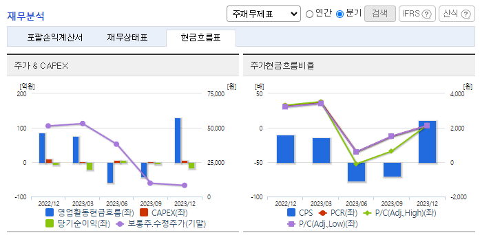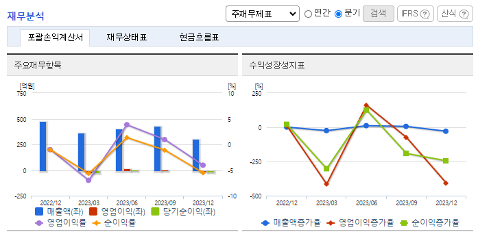 -2023년 12월 전년동기 대비 연결기준 매출액은 22% 감소, 영업손실은 53.4% 감소, 당기순손실은 29.8% 감소. 2023년은 러시아-우크라이나 전쟁의 지속 및 중동지역의 국지적인 전쟁 발발 등의 여파 등으로 인한 고환율, 고금리, 인플레이션 경제적 위험이 복합적으로 존재했음. 동사는 어려운 경영사항을 타파하기 위해 새로운 비즈니스 모델과 장기적으로 수익을 창출할 수 있는 미래사업 발굴을 계속하여 위기를 극복하고자 함.