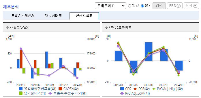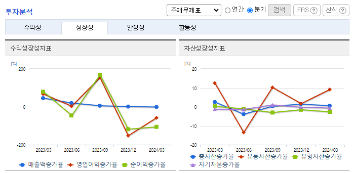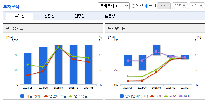 -2024년 3월 전년동기 대비 연결기준 매출액은 25.4% 증가, 영업손실은 56.7% 감소, 당기순손실은 62.5% 감소. 지난해 3분기 이후 기초유분 및 MC4, 폴리머 등의 판가 회복으로 외형 확대되었으며, 원가율 하락 영향으로 영업수익성 또한 크게 개선된 모습. 미국 및 중국 등의 대규모 투자로 공급 증가가 지속적으로 우려되는 상황에서 산업의 성장성이 이를 어느 정도 상쇄할지가 실적 개선의 관건임.