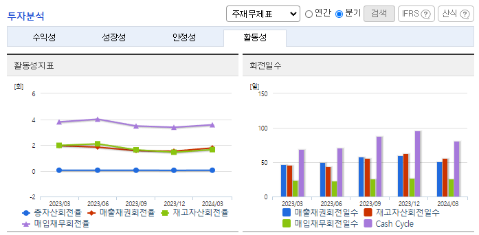 -2023년 12월 전년동기 대비 별도기준 매출액은 10.9% 감소, 영업이익은 62.5% 감소, 당기순이익은 68.8% 감소. 주력제품인 Polyester의 수출 감소로 외형 축소되었으며, 수익성 측면에서는 원가율 하향 안정되는 모습에도 불구하고 영업이익률 하락한 상황. 안정적인 매출 확보 전략 속에서 향후 고부가가치 제품 개발 및 제품 다변화를 적극 추진하여 추가 경쟁력을 확보할 것으로 기대.