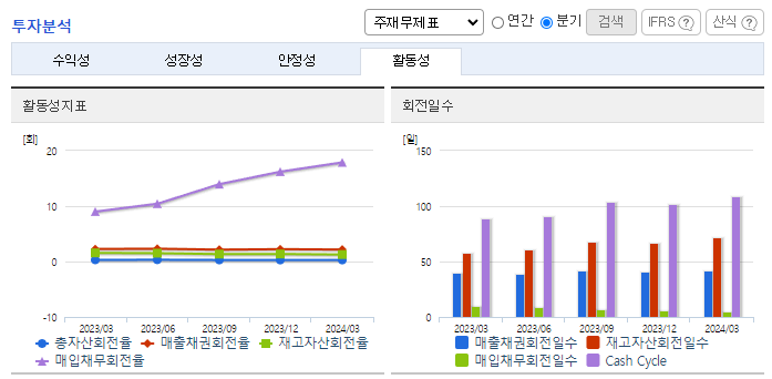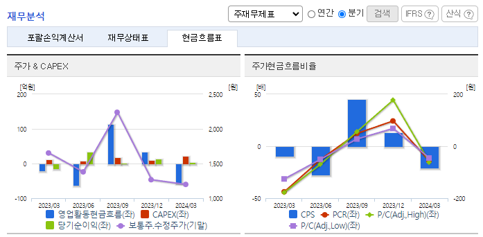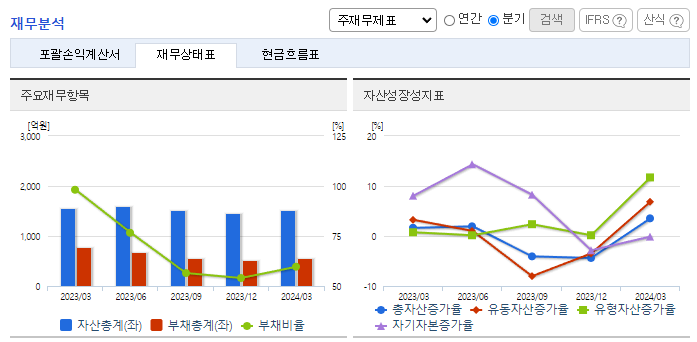 -2024년 3월 전년동기 대비 별도기준 매출액은 12.2% 감소, 영업이익은 345.5% 증가, 당기순이익 흑자전환. 경쟁심화에 따른 매출이 10%감소하였으나, 원재료 가격이 정상화되어 원가 비중이 크게 감소하였음. 이에 따라 영업이익률이 크게 상승함. 경쟁심화에 따라 다양한 업체의 개발 및 해외업체의 모색 그리고 자동차부품 및 전기전자부품, 전기차 배터리케이스 등 그 시장을 넓혀 매출증대에 힘쓰고 있음.