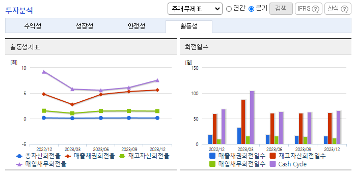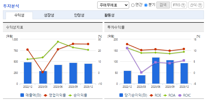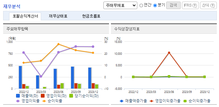 -2023년 9월 전년동기 대비 연결기준 매출액은 7.6% 감소, 영업이익은 39% 감소, 당기순이익은 20% 감소. 매출액 감소와 함께 매출원가도 -6.2%를 기록하며 함께 감소했지만, 판관비는 오히려 87.3% 증가하면서 수익성에 부담을 줌. 판관비가 큰 폭으로 증가한 이유는 인건비 및 복리후생비가 10.7% 증가, 지급수수료가 80.52% 증가 등 비중이 큰 비용들이 전체적으로 증가했기 때문임.