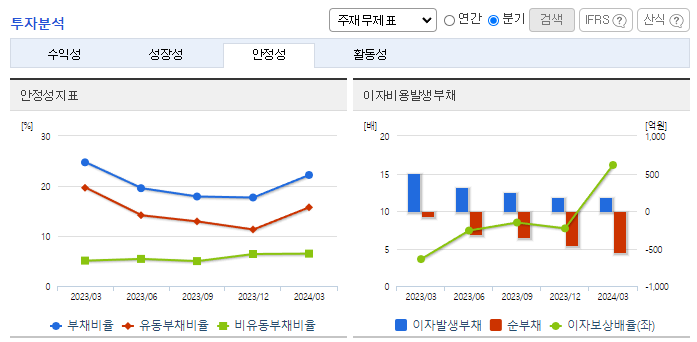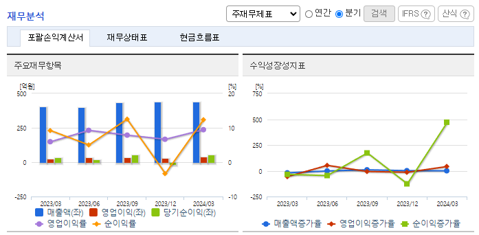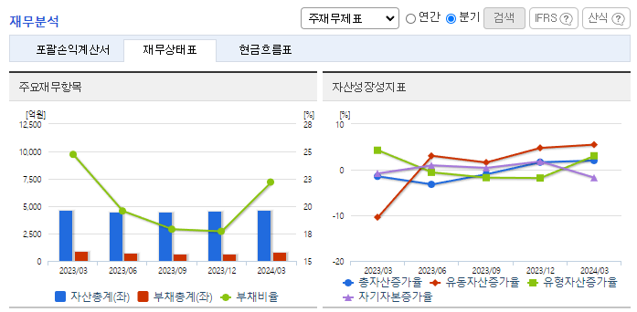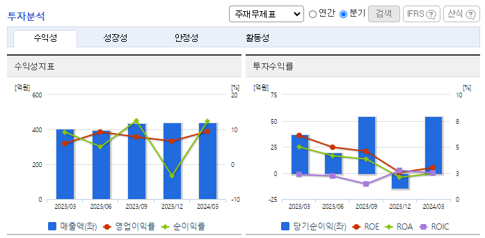 -2023년 12월 전년동기 대비 연결기준 매출액은 18.5% 감소, 영업이익은 44.4% 감소, 당기순이익은 59.5% 감소. 자동차튜브 수요의 감소로 인해 전기대비 매출액은 38,111백만 원, 18.52% 감소하였고, 베트남공장의 본격적인 가동으로 인한 비용증가로 영업이익은 9,927백만 원, 44.36% 감소. 유동비율은 323.08%, 차입금의존도 4.15% 로 안정적인 유동성을 유지하고 있음.