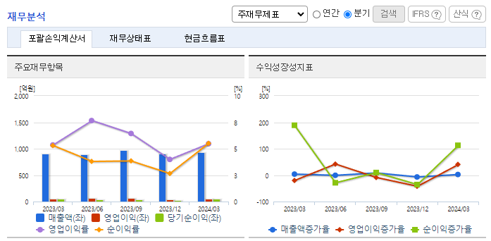 -2023년 12월 전년동기 대비 연결기준 매출액은 5.5% 증가, 영업이익은 49.8% 증가, 당기순이익은 7% 감소. 해외법인 신규거래처, 아이템 증가로 인한 외형은 확대되었으며, 원가절감등 경영합리화를 통해 영업이익 또한 증가세를 유지함. 최고의 품질과 가격경쟁력을 갖춘 제품으로 자동차와 전자분야의 매출확대와 전기분야 등 신시장 개척을 통한 사업다각화로 외형 확대를 기대함.