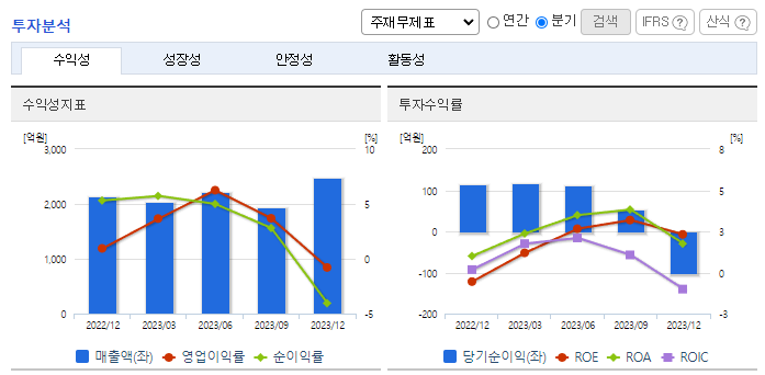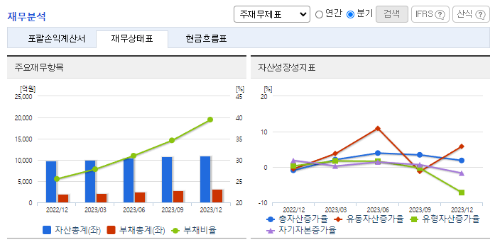 -2023년 12월 전년동기 대비 연결기준 매출액은 12.8% 증가, 영업이익은 235% 증가, 당기순이익 흑자전환. 섬유, 기타 사업부문을 제외한 건재, 건설, 플랜트 부문에서 고루 성장함에 따라 매출이 증가하였으며 비용절감을 통해 영업이익 크게 성장함. 동사의 당기 주요 신규투자로는 130억 원 상당의 골재공장 신설이 있으며, 현재 건물 및 구축물 등으로 대체되었음.