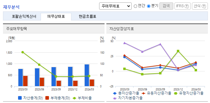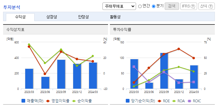 -2023년 12월 전년동기 대비 별도기준 매출액은 122.4% 증가, 영업이익 흑자전환, 당기순이익 흑자전환. 동사는 전년 대비 영업이익과 순이익이 흑자전환 하였는데, 이는 전방산업 업황 개선과 당사 OIS제품 등 매출 증가에 따른 수익성 개선의 영향임. 동사는 반도체 업황 회복등의 호재가 겹체면서 전년대비 매출액이 122.3% 가까이 상승했고, 이에 따라 전반적인 재무지표가 개선됨.