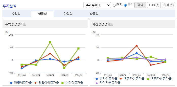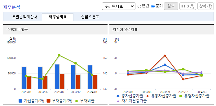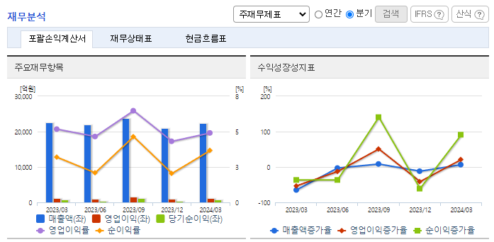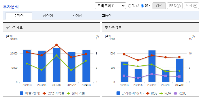 -2024년 3월 전년동기 대비 연결기준 매출액은 1% 감소, 영업이익은 6.2% 감소, 당기순이익은 10.8% 증가. 동사는 아셉틱 사업을 신규사업으로 하여 2024년 3호기 생산라인과 자동화 창고를 증설하여 생산 증대는 물론이고, 정확하고 안전한 제품 관리를 실현하여 종합 포장재 사업의 역량을 총동원함. 2024년 1분기 기준 동사의 식품사업 매출은 증가했지만 건설경기 불황으로 소재 및 건설사업의 매출은 감소함.