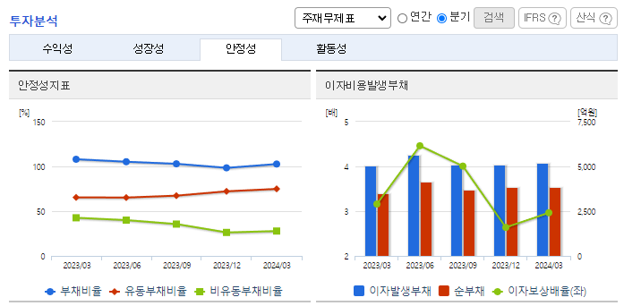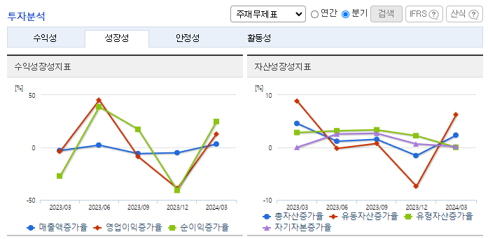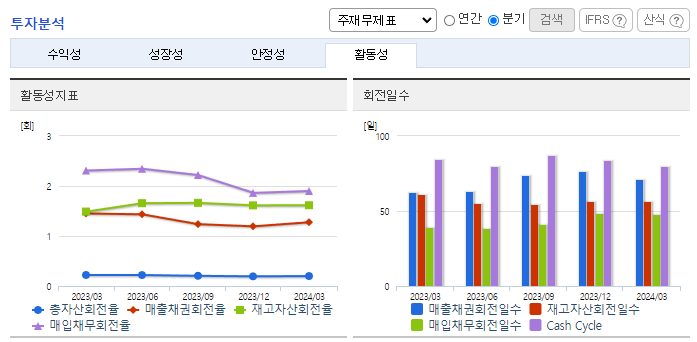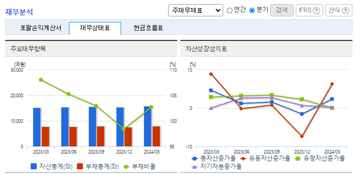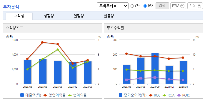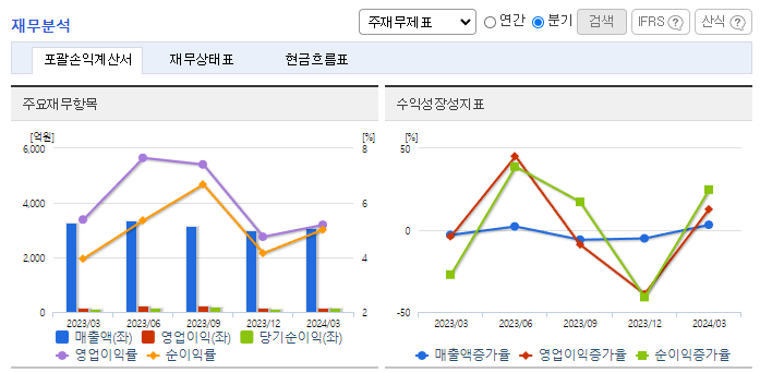 -2024년 3월 전년동기 대비 연결기준 매출액은 5.6% 감소, 영업이익은 9% 감소, 당기순이익은 20.1% 증가. 연포장/PET/유리병, 알미늄, 수지, 기타부문의 매출액이 전년동기 대비 감소하고 경상개발비, 세금 등 판매비와 관리비 및 인건비가 증가하면서 영업이익이 감소됨. BTC 등의 고부가 제품의 비중을 지속적으로 확대하여 매출 확대와 수익성 개선에 힘쓰고 있음.