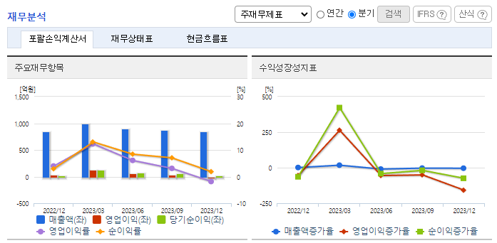 -2023년 12월 전년동기 대비 연결기준 매출액은 6.1% 증가, 영업이익은 37.2% 감소 매크로 환경에 따른 매출 직접비, 매출창출을 위한 마케팅 관련 비용과 연구개발비가 증가, 사업확장을 위한 헬스케어 사업 초기 투자비용을 위한 일시적 투자비용이 증가해 수익성 악화했음. 신약개발의 주요 분야는 항감염제, 항암제, 호흡기계, 면역염증성질환 등의 치료제 개발에 연구력을 집중하고 있음.