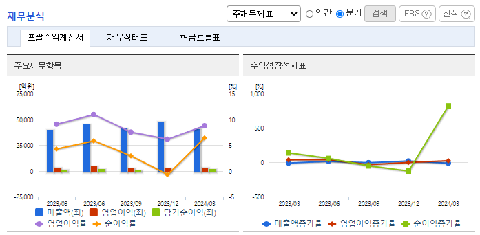 -2024년 3월 전년동기 대비 연결기준 매출액은 1.4% 증가, 영업이익은 1.8% 감소, 당기순이익은 107.3% 증가. 하반기 체코 원전 수주 결과가 발표될 예정이며 아랍에미리트 수주도 기대되고 있음. 영국, 네덜란드 등에서도 대형 원전 도입을 계획하면서 순항이 예상됨. 국내 복합발전소 주기기, 국내외 복합발전소 EPC, 신재생 프로젝트 등 다양한 풀을 기반으로 올해 연간 수주 전망을 6조 3,000억 원으로 유지하고 있음.