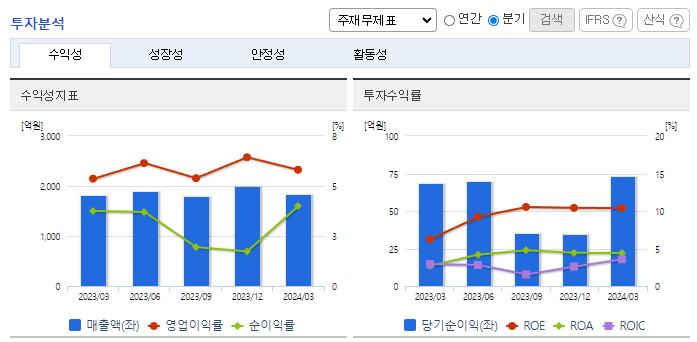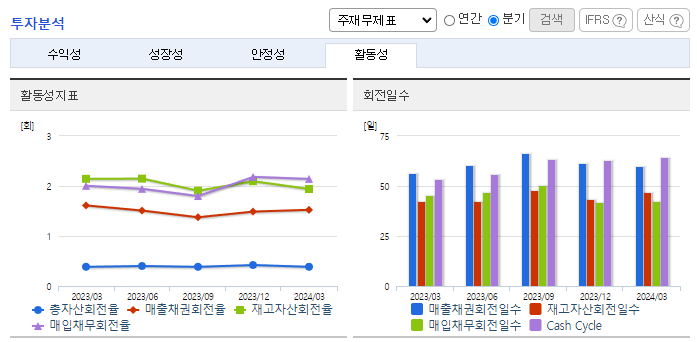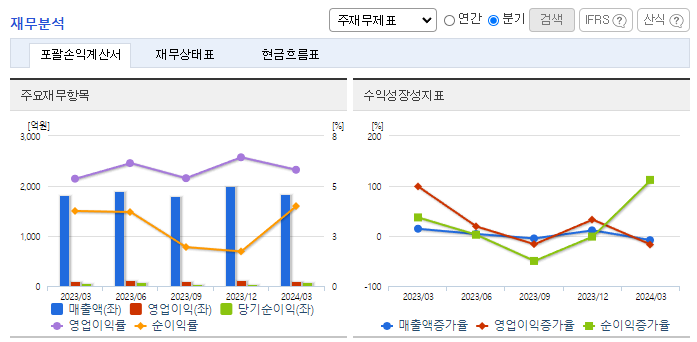 -2024년 3월 전년동기 대비 연결기준 매출액은 1.2% 증가, 영업이익은 9.6% 증가, 당기순이익은 6.8% 증가. 내수 및 유럽시장의 선전으로 전년동기 실적 소폭 상회하는 외형 기록하였으며, 염료 등 원부자재 가격의 안정 및 비용 절감 영향으로 수익성 또한 상승한 모습. 고부가가치 제품 판매 확대를 통한 수익성 추가 개선 노력 중. 또한 신규 거래처 확대를 통한 외형 확대 시도 중.