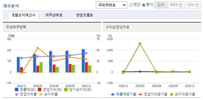-2023년 9월 전년동기 대비 별도기준 매출액은 57.4% 증가, 영업이익은 73.8% 증가, 당기순이익은 31.9% 증가. 동사의 실적은 2021년 첫 영업 흑자를 기록하면서 2022년 약 500억 원 수준으로 성장하였고, 당분기말 기준 당기순이익 22,110백만 원 달성함. 버블 최근 가입자 추세는 꾸준히 상승하는 추세임. 2023년 1분기 190만 명, 2분기 220만 명, 3분기 260만 명으로 꾸준히 증가하고 있음.
