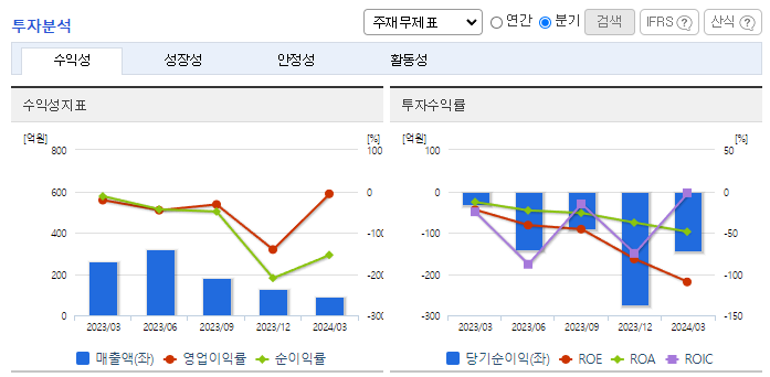 -2024년 3월 전년동기 대비 연결기준 매출액은 64.6% 감소, 영업손실은 89.8% 감소, 당기순손실은 350.8% 증가. 2024.04.30 IBK기업은행에 당사 만기도래 어음이 제시되었으나, 2024.04.24 수원회생법원의 재산보전처분 및 포괄적 금지명령 결정으로 채무연장 및 변제를 할 수 없어 2024.05.02 결제가 미이행. 채무자에 대하여 회생절차를 개시, 2024.10.08까지 회생계획안 제출 예정.
