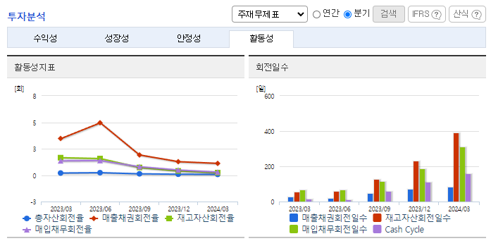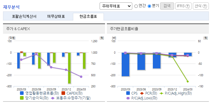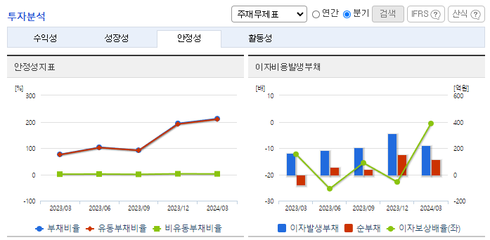 -2024년 3월 전년동기 대비 연결기준 매출액은 64.6% 감소, 영업손실은 89.8% 감소, 당기순손실은 350.8% 증가. 2024.04.30 IBK기업은행에 당사 만기도래 어음이 제시되었으나, 2024.04.24 수원회생법원의 재산보전처분 및 포괄적 금지명령 결정으로 채무연장 및 변제를 할 수 없어 2024.05.02 결제가 미이행. 채무자에 대하여 회생절차를 개시, 2024.10.08까지 회생계획안 제출 예정.