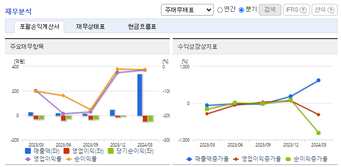 -2023년 12월 전년동기 대비 연결기준 매출액은 57.6% 감소, 영업이익 적자전환, 당기순손실은 1718.2% 증가. 연구개발 투자의 감소등으로, 인공지능 솔루션 기반의 매출이 큰 폭으로 감소하였음. 이에 매출급감과 더불어 적자로 전환함 AI 및 플랫폼에 대한 투자를 지속하여 클라우드 MSP기업인 티디지를 인수하고 AI플랫폼의 출시와 시너지를 통해 매출액을 증대할 예정