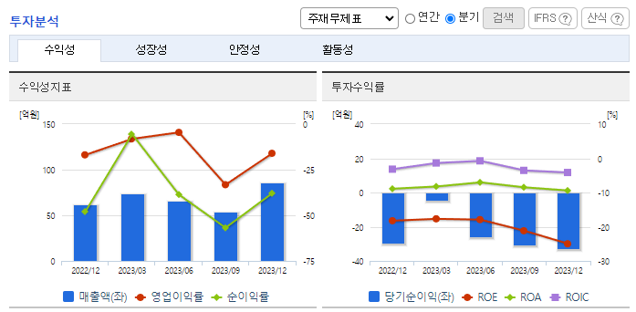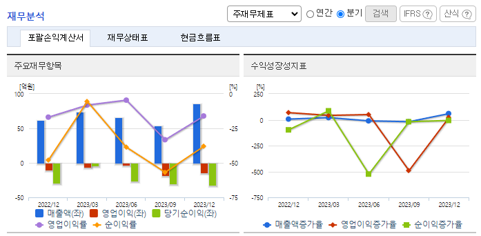 -2023년 12월 전년동기 대비 연결기준 매출액은 18.2% 증가, 영업손실은 38.2% 감소, 당기순손실은 3.4% 증가. 원가율 악화에도 불구하고 광고선전비 및 지급수수료 등과 같은 판매비와 관리비 등 비용감소에 노력하여 영업손실 폭이 축소됨. 동사의 주력 제품인 마이크로니들 패치를 통해 미국 및 일본에서 안정적인 고객사를 확보하였고 국내 매출 비중을 증가시키는데도 노력하고 있음.