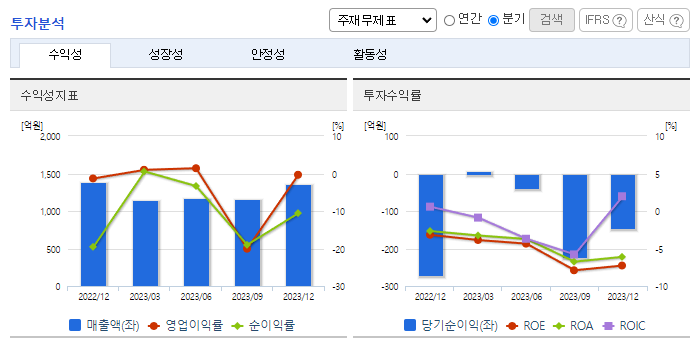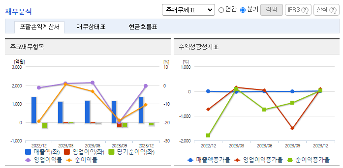 -2023년 12월 전년동기 대비 연결기준 매출액은 7% 감소, 영업이익 적자전환, 당기순손실은 94.9% 증가. 2023년 하반기 미주시장에서의 수출사업 성장에도 불구하고, 중국의 경기둔화 및 한국의 수익성 중심 채널정비로 홈쇼핑 채널 매출 감소하며 외형 축소. 원가율 악화까지 겹치며 영업이익이 큰폭으로 감소 적자전환. 2023년 중 한국법인 안성사업장의 직접생산을 중단하고 국내 제삼자 생산으로 전환하는 등 효율성 개선 노력 중