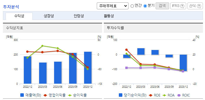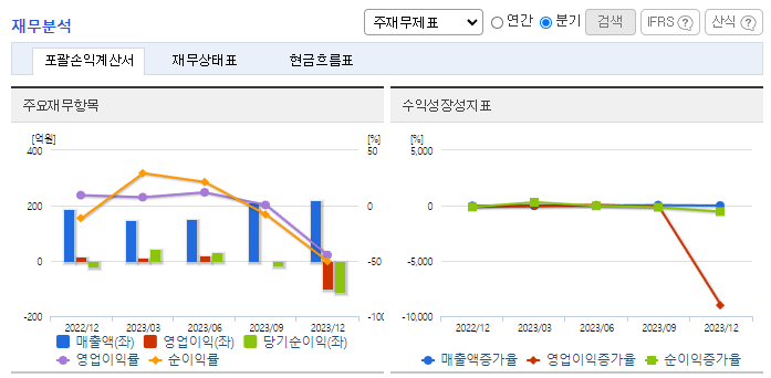 -2023년 12월 전년동기 대비 연결기준 매출액은 49.5% 감소, 영업이익 적자전환, 당기순이익 적자전환. 주력분야인 분자진단서비스 용역 매출의 부진으로 외형 축소된 상황이며, 고정비 부담 증가 여파로 수익성 또한 하락하며 적자 전환. 코로나 진정으로 진단키트분야의 성장성은 둔화될 것이나, 분자진단 분야에서의 경쟁력 계속 강화되고 있어 장기적 관점에서 실적 개선 가능할 것으로 기대.