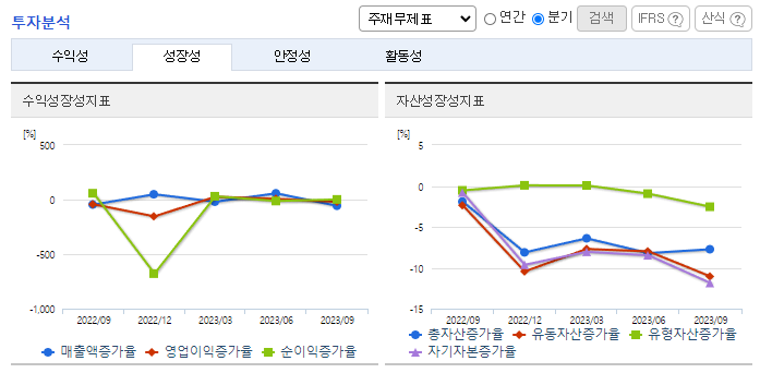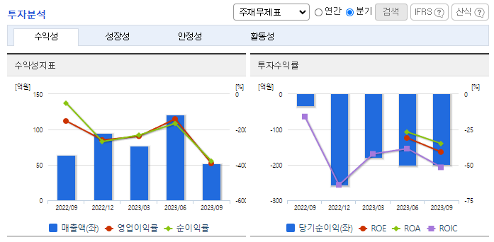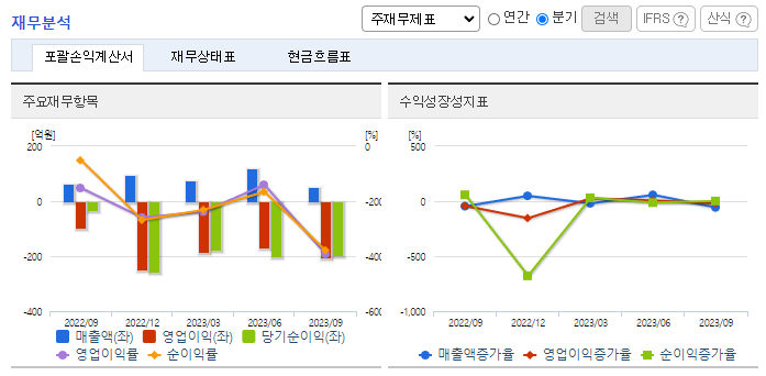 -2023년 9월 전년동기 대비 연결기준 매출액은 4.4% 증가, 영업손실은 116.5% 증가, 당기순손실은 193.8% 증가. 합성신약부분에는 중국의 Haihe와 그람양성균 항생제기술이전 그리고 국내 브리지바이오와 항섬유화제 기술이전계약을 체결하여 23년 3분기 약 91억 원의 매출이 발생함. 의약사업부문은 20년부터 손실사업을 정리하고 수익성 사업만 진행하여 23년 3분기까지 159억 원의 매출이 발생함.