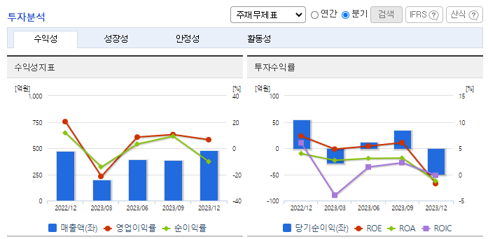 -2023년 9월 전년동기 대비 연결기준 매출액은 19.7% 증가, 영업이익은 54.5% 감소, 당기순이익은 17.8% 감소. 매출액은 증가하였으나, 매출원가와 판관비가 13.1%, 43.9% 증가하면서 영업이익이 대폭 감소함. 판관비 중 대부분의 비용이 증가했지만, 특히 인건비 및 복리후생비가 37.6% 증가, 광고선전비가 232.20% 증가하며 수익성에 악영향을 줌.