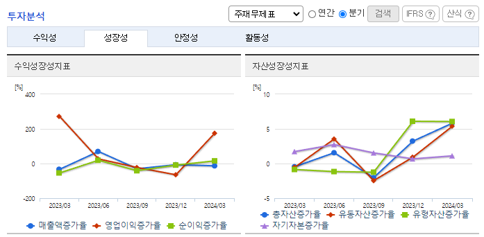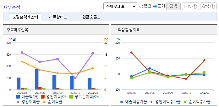 -2024년 3월 전년동기 대비 연결기준 매출액은 3.4% 감소, 영업이익은 5.3% 감소, 당기순이익은 26.2% 감소. 동사는 전방산업인 FPD, OLED산업의 투자감소가 지속되고 있으며 인건비 등 고정비용 지출에 따른 영업이익도 감소함. 2024년은 주요 고객사의 투자계획과 반도체 수요 증가 및 개발장비의 시장개척을 통해 영업이익이 최대화되도록 할 계획임.