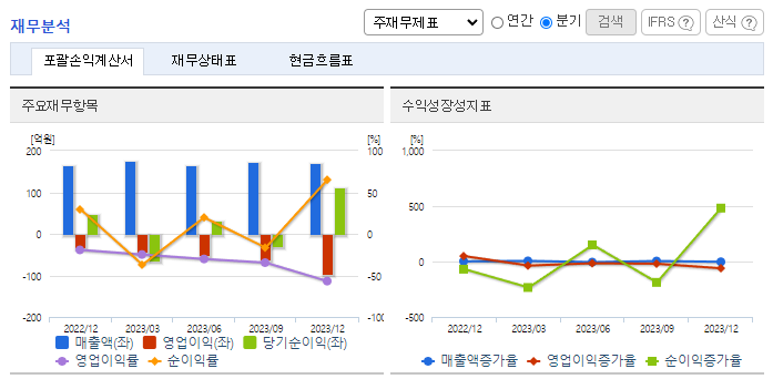 -2023년 12월 전년동기 대비 연결기준 매출액은 6.9% 증가, 영업손실은 44.3% 증가, 당기순이익은 90.3% 증가. 줄기세포 치료제 및 줄기세포 배양액 매출 등이 증가하여 전체 외형 확대되었으나, 판매관리비 증가 및 인건비 등의 비용 상승으로 영업손실 확대. 카티스템으로 일본, 말레이시아 등 해외시장 진출을 위한 임상 및 품목허가 등 절차 진행 중. 무릎관절염치료제 스멉셀은 국내 임상 2상이 승인되고 미국 임상 추진 중임.