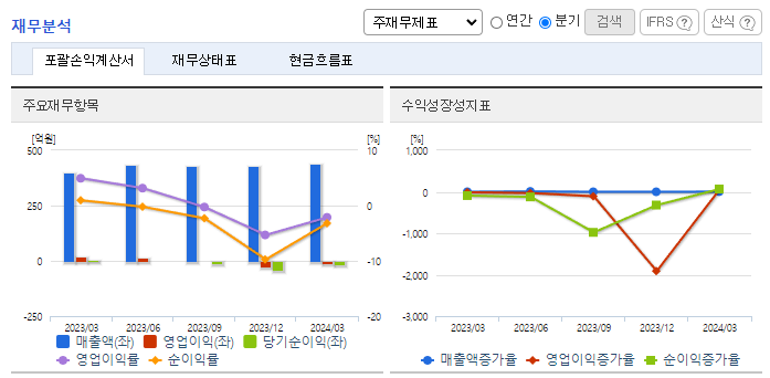 -2023년 12월 전년동기 대비 연결기준 매출액은 12.1% 증가, 영업이익은 63.3% 감소 글로벌 통화긴축 지속, 지정학적 이슈 등 불확실성의 지속 및 경기둔화로 경영조건 악화. 결국 영업이익도 전년 대비 감소했음. 급성요통의 적응증을 가진 MMP-301을 비롯한 개량신약 및 나판주 등의 제네릭 의약품 외 항암제 및 치매치료제의 원료물질 등의 연구개발을 진행.