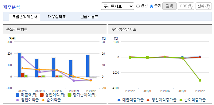 -2023년 12월 전년동기 대비 연결기준 매출액은 7.2% 감소, 영업이익은 96.9% 감소, 당기순이익은 86.2% 감소. 주요 매출처의 산업 경기 지표 악화에 따라 고객사 개발 계획 축소로 프로토타입 수주량이 감소하였고, CM사업부 대형프로젝트 연기로 2023년 매출이 역신장함. 비용 상승 요인으로는 높은 단가의 레진 사용 증가, 대형 금형 제작물과 이중 사출이 요구되는 프로젝트에서 외주가공이 증가 때문.