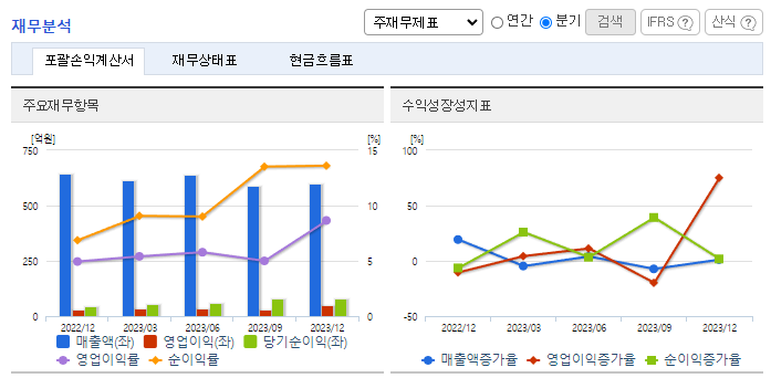 -2023년 12월 전년동기 대비 연결기준 매출액은 9.1% 증가, 영업이익은 9.9% 증가, 당기순이익은 27.8% 증가. 하이브리드용 차량 판매 증가에 따라 매출이 전년 대비 증가. 이자수익 증가 및 해외법인인 북경모토닉 청산 완료에 따른 종속기업투자처분이익 발생으로 수익 개선. 수소전기차 고압 저장 시스템의 핵심 부품 REGULATOR 외 2종을 주로 현대자동차(주) 및 기아(주)차량에 적용함.