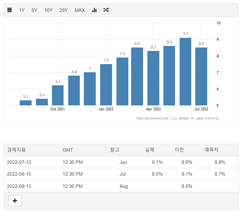 22. 08. 10 미국 소비자 물가 지수 (CPI) 및 물가 상승률이 발표되었다. 지금까지 금리를 높인 효과가 나와야 금리가 더 오르지 않을 것으로 기대할 수 있을 것이다.