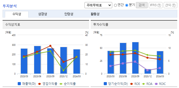 -2024년 3월 전년동기 대비 연결기준 매출액은 3.1% 감소, 영업이익은 5.8% 감소, 당기순이익은 18% 감소. 매출액 감소에도 매출원가가 25.6% 증가하며 영업이익에 악영향을 줌. 후 보유 인력들의 노하우를 적극 활용하여 영화, 드라마 등의 영상 콘텐츠 제작을 통해 사업영역을 지속 확대해 나가며, 소속 아티스트들을 제작 콘텐츠에 출연시킴으로써 시너지를 극대화하는 방안을 모색하고 있음.
