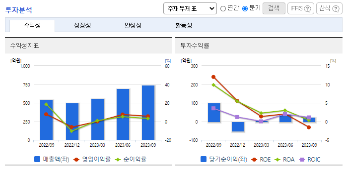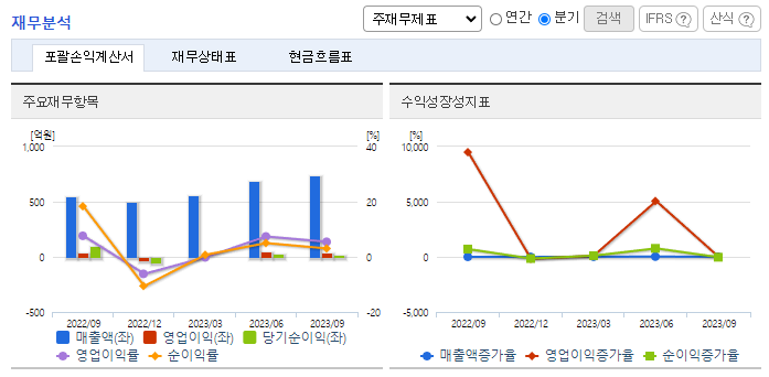 -2023년 9월 전년동기 대비 연결기준 매출액은 18.1% 증가, 영업이익은 38% 감소, 당기순이익은 87.6% 감소. 기능성 유산균을 제조 판매하는 프로바이오틱스부문의 성장으로 외형 증가세 유지함. 다만, 분자진당 등 바이오부문의 부진은 아쉬운 상황. 인건비 및 판관비 등의 급증으로 수익성은 하락한 모습이나, 점차 비용구조 안정될 것으로 보여 향후 수익성 지표 개선될 것으로 기대함.