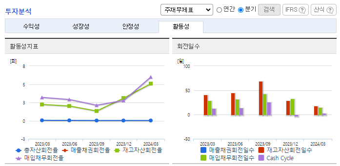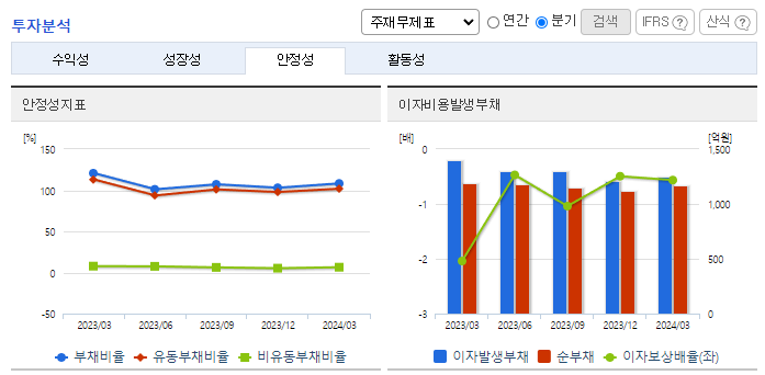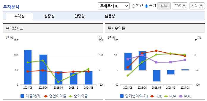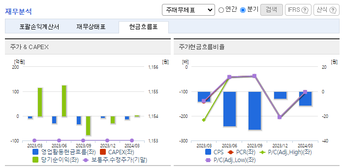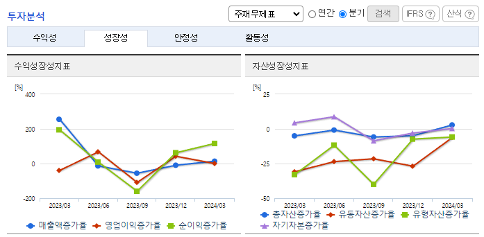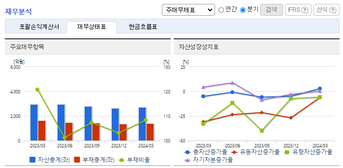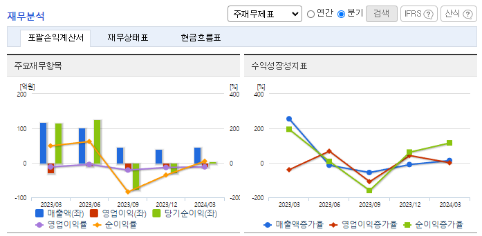 -2024년 3월 전년동기 대비 연결기준 매출액은 7.8% 감소, 영업손실은 49.4% 감소, 당기순이익 적자전환. 구조조정에 따른 중단사업으로 매출이 감소하였고, 검찰 및 세무조사 대응에 따른 회계 및 법무비용이 증가함. 2024.03.28 '감사보고서 제출' 공시에서 감사범위 제한으로 인한 '감사의견거절'임을 공시함에 따라 상장폐지사유가 발생하여 심의 중이며, 거래정지 상태임.