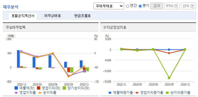 -2023년 9월 전년동기 대비 연결기준 매출액은 22% 감소, 영업손실은 462.2% 증가, 당기순손실은 534.7% 증가. 신약개발에 투자해야 하는 업종 특성상 연구개발비/매출액 비율이 25.29%에 이르고 이에 적자가 누적되고 있음. 2023년 신경퇴행성 질환치료제 개발 이스라엘 회사인 ProteKt Therapeutics Ltd를 인수하였음. 면역항암제 개발 합작법인 ‘재규어테라퓨틱스’에 추가 출자했음.