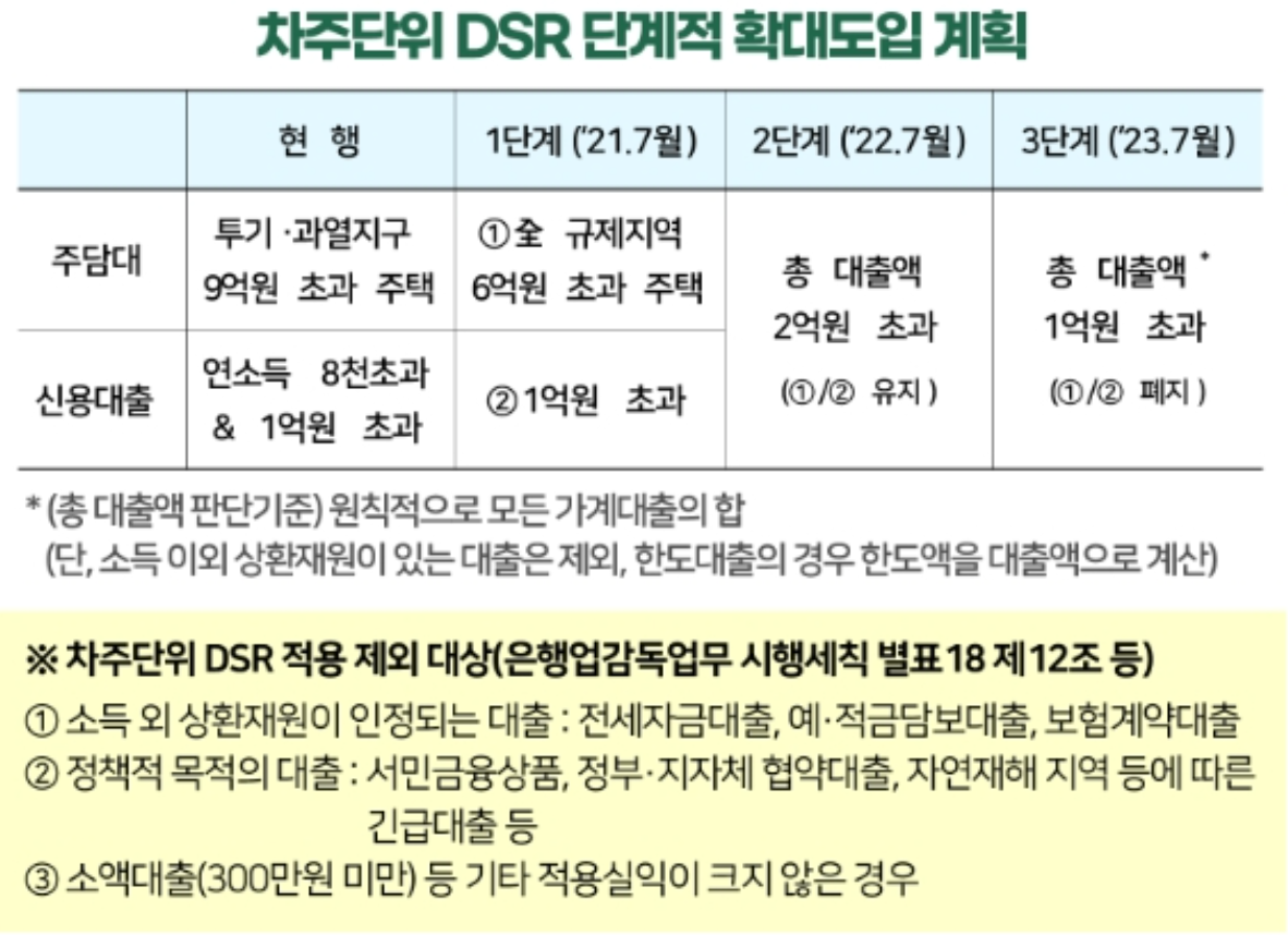 이전 발표된 자료를 보면 23년 7월부터 총 대출액 1억원 초과일 경우 DSR 40% 수준으로 적용이 된다고 했으나, 1년 앞당겨 22년 7월부터 적용이 된다.
