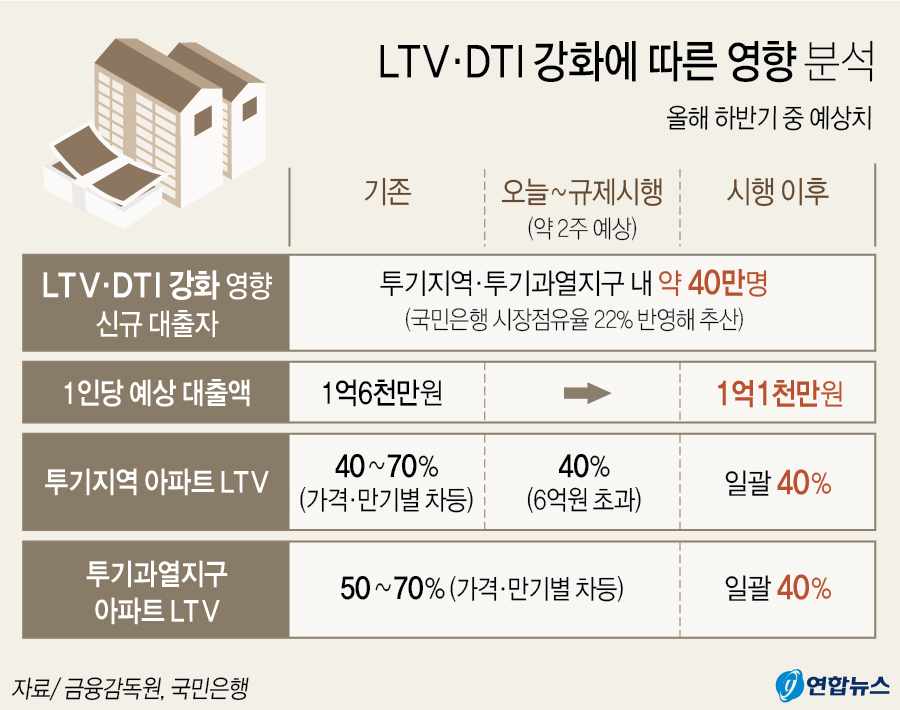 아래는 2017년도 LTV, DTI 가 강화되었던 때 기사에서 발췌한 자료이다. 현재도 투기지역, 투기과열지구는 LTV 40% 이며, 생애최초 구입자에 한해서만 LTV 가 풀려있는 상황이다.
