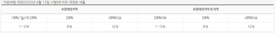 - 조정대상지역 1세대 3주택이상, 조정대상지역 외 지역 1세대 4주택 이상 : 1.0%