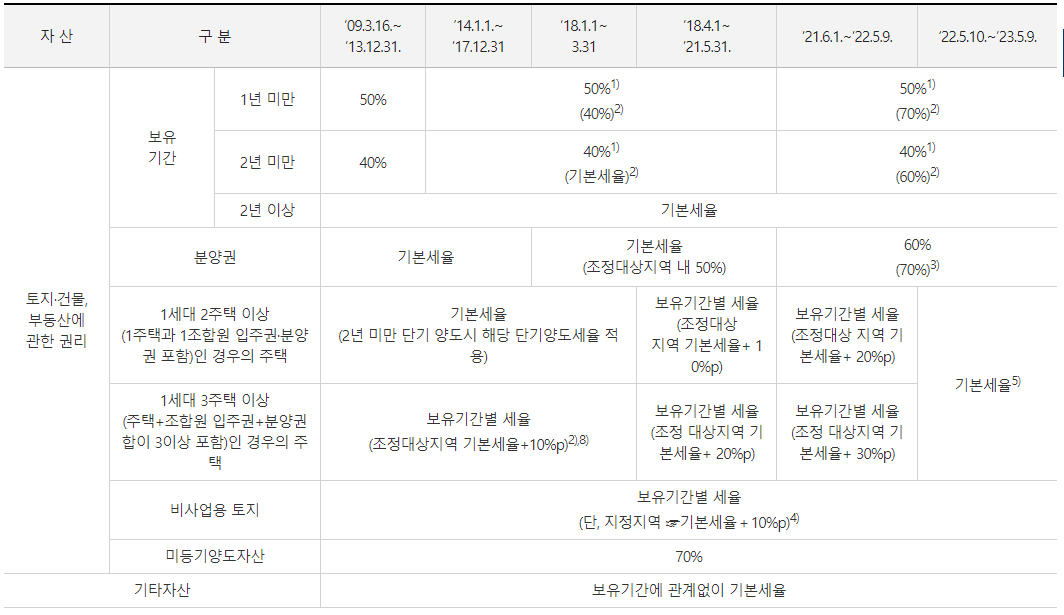 이제 여기서 보유 기간에 따른 세율적용이 다르다. 아래의 표를 참고하면, 2년 이상을 보유해야만 위 기본공제를 받을 수 있다. 표에서 1)과 2)로 세율이 조금 다른데,