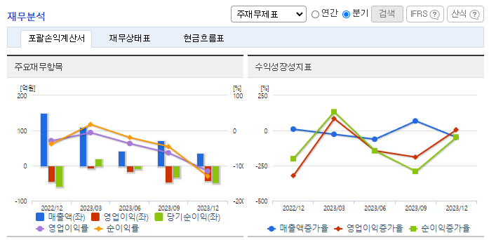 -2023년 12월 전년동기 대비 연결기준 매출액은 81.6% 감소, 영업이익 적자전환, 당기순이익 적자전환. 대외경기 불확실성 확대에 따른 반도체 수요둔화가 글로벌 반도체 제조사들의 투자를 위축시키고 있으며, 동사도 이에 따른 타격을 받음. 동사는 차세대 디바이스에 대한 공정기술 확보, 수출비중 확대 및 거래처 다변화를 통하여 매출 성장성 및 안정성을 더욱 강화해 나갈 계획임.