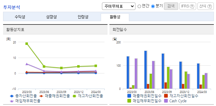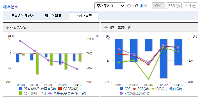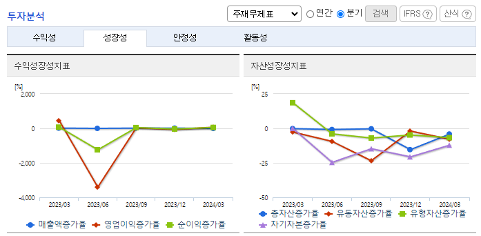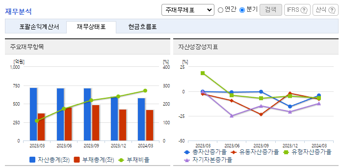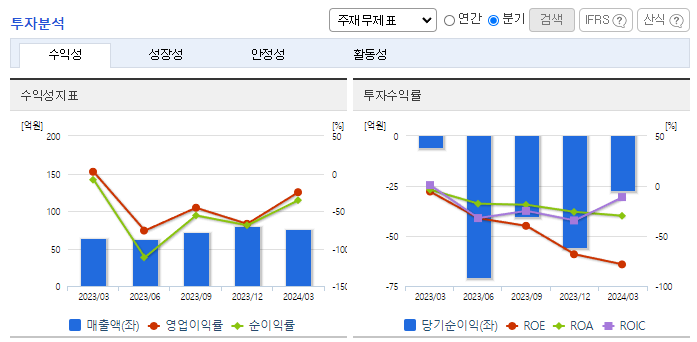 -2024년 3월 전년동기 대비 연결기준 매출액은 19.2% 증가, 영업이익 적자전환, 당기순손실은 348.8% 증가. 일반 IS SI 매출이 증가하였지만 용역비 및 지급수수료와 같은 판관비와 인건비가 대폭 증가하여 영업이익이 적자전환됨. 빅데이터/AI 시장 기반의 Graph 분석 영업 기회 지속적 확보 및 솔루션 기반의 영업기회 확보 (FDS, 예측분석시스템, 지식그래프 등)로 실적확대에 노력.